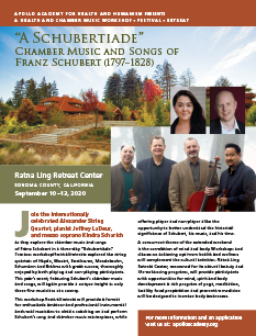 Our second workshop/festival/retreat on the string quartets of the German Romantic masters, Mendelssohn, Schumann, and Brahms was a great success, enjoyed by both playing and non-playing participants. We are now pleased to announce our event for the extended weekend of September 10-13, 2020 entitled, A Schubertiade: Chamber Music and Songs of Franz Schubert (1797–1828). This four-day health and chamber music workshop/festival/retreat will again be held at the Ratna Ling Retreat Center in Sonoma County.